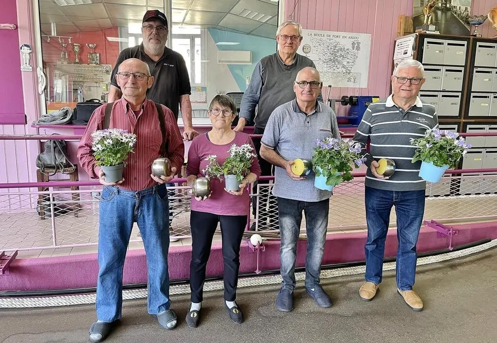 Michel et Monique Fourrier (à gauche) se sont inclinés en finale face à Bernard Chapeau et Michel Couet (à droite), samedi 13 avril 2024, en présence notamment de Philippe Barbaud, président de la société de boule de fort parcéenne, et Vincent Boivin, responsable fédéral du secteur. © Ouest-France