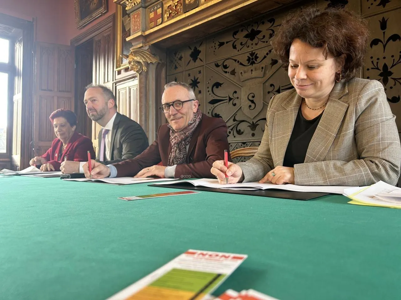 Saumur, mardi 25 novembre 2025. Le maire Jackie Goulet, la procureure de la République Alexandra Verron, le sous-préfet Christophe Carol et la première adjointe Astrid Lelièvre ont signé ce contrat. © CO