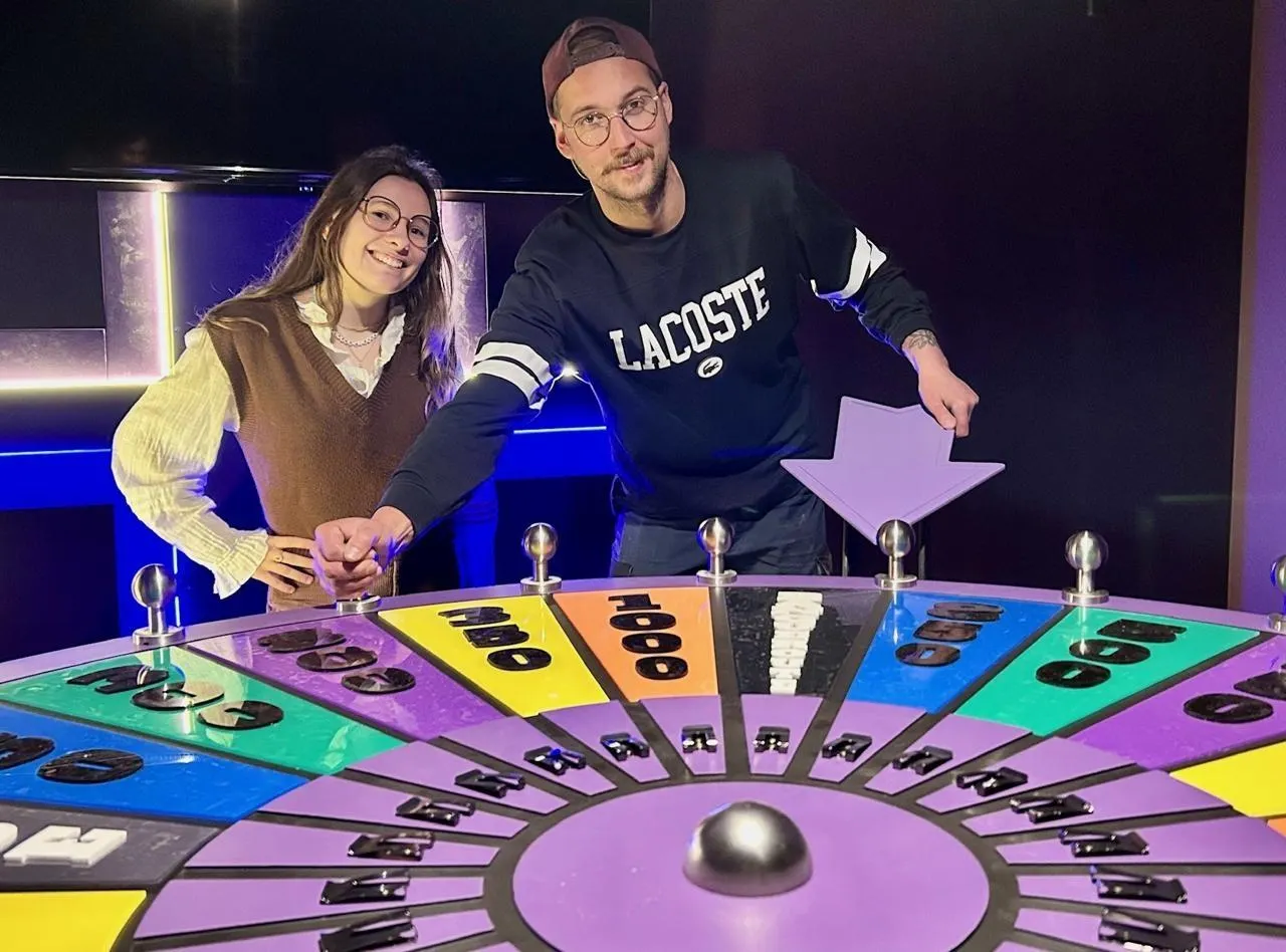 Trélazé, boulevard Dautel, le 16 février 2026. Rémi Buge et Mathilde Tardy devant la fameuse roue du jeu Roue by Cube. © CO