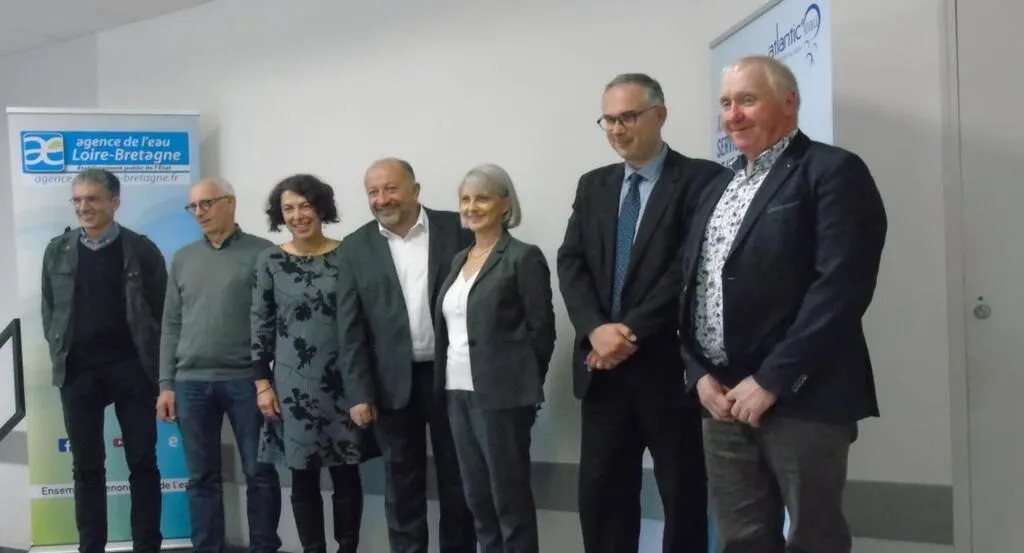 Laurent Lelore (chambre d’agriculture), Jean-Luc Grégoire (Atlantic eau), Morgan Priol, directrice de l’agence de l’eau Loire-Bretagne ; Thierrey Gallard, président du Syndcat d’eau de l’Anjou ; Marie-Pervenche Plaza, sous préfète de Saumur ; Pierre Chauleur, sous-préfet de Châteaubriant ; et Jean-Pierre Bru, maire délégué du Louroux-Béconnais. © Ouest-France