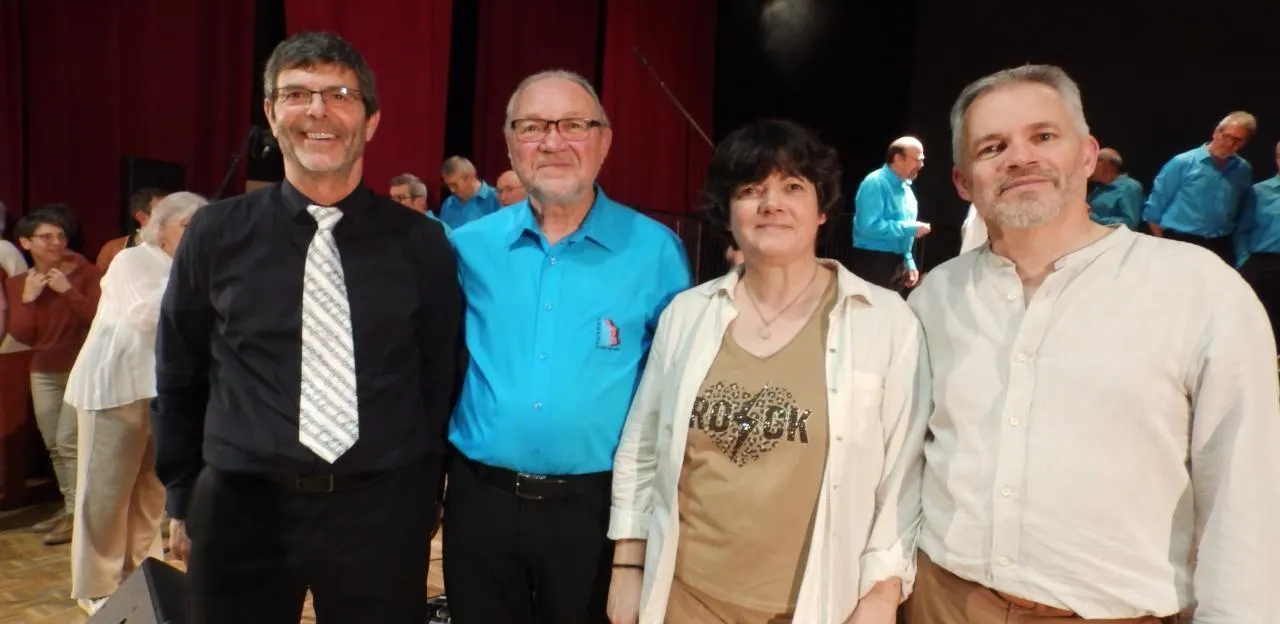 Pascal Robert, chef de chœur d’Éclats de voix, René Beauduffe, président de la chorale candéenne, Sylvie Lebeau, cheffe de chœur de La Cantaria, et Cyrille Langevin, président de la chorale voisine. © CO
