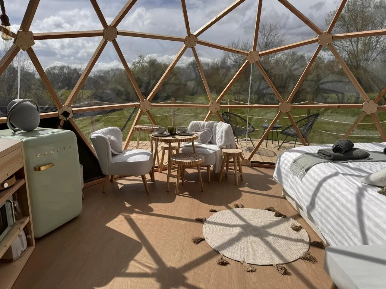 En plus du couchage, la Géode étoilée compte une kitchenette avec tout le nécessaire, une salle de bains avec WC, une vaste terrasse, l’électricité et l’eau courante. Sans oublier, pour les nuits plus fraîches, un poêle à bois et des couvertures chauffantes pour encore plus de réconfort.