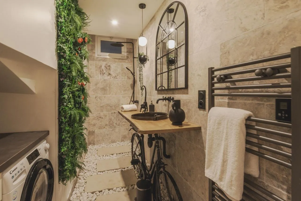 Pierre naturelle, parquet à bâton rompu, moulures, cheminée à vapeur d’eau… Ici, tout a été pensé avec soin. Sans oublier le petit brin de folie qui fait la différence, comme le plafond végétal qui veille sur la cuisine moderne, ou encore l’étonnante salle de bains où les pavés de Chine sont bordés de galets et où un ancien chaudron à rillettes a été transformé en lavabo, monté sur un vélo anglais vintage. Renversant !