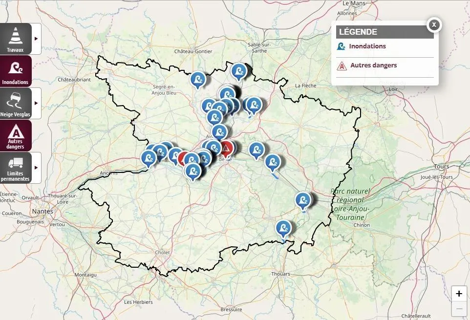 De ce fait, plusieurs rues du centre-ville de la cité angevine sont coupées. Des ponts sont interdits à la circulation et des axes routiers départementaux sont impraticables. On fait le point.