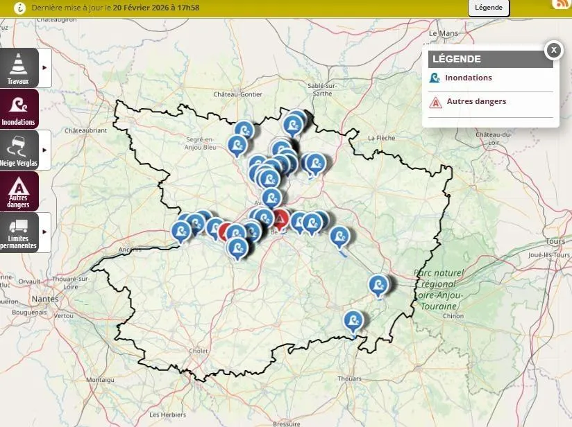 Ce vendredi 20 février 2026 à 17 heures, le Département de Maine-et-Loire a mis à jour les axes fermés à la circulation. Une donnée toujours en hausse et ce malgré une rare bonne nouvelle : la réouverture de la RD132 dans les deux sens, entre Les Ponts-de-Cé et Saint-Jean-de-la-Croix.