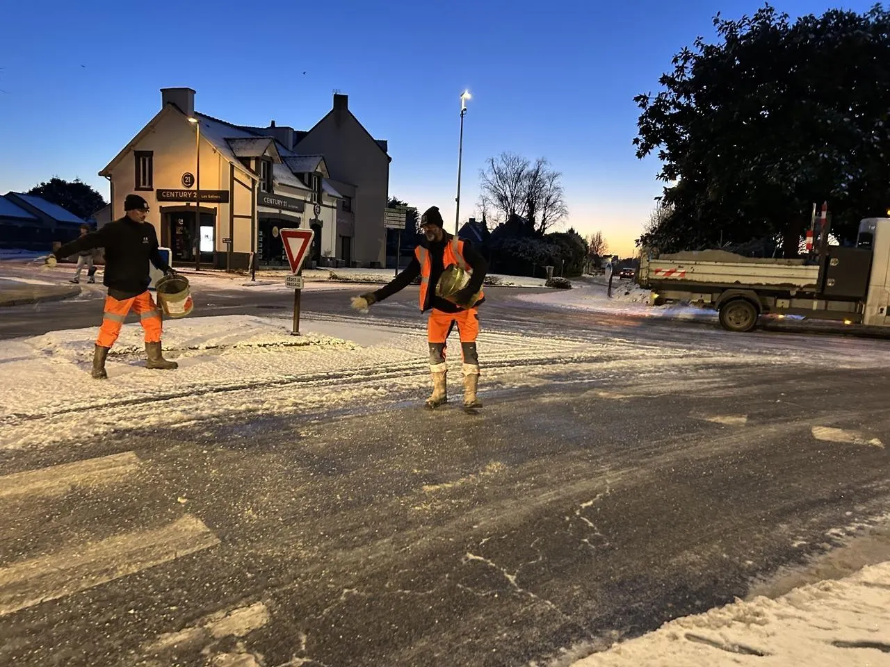 Pour lutter contre la neige et le verglas, le sel demeure très efficace. Ici, les agents de la voirie dans les rues de Guérande, mardi 6 janvier, à 8 h. © Ouest-France