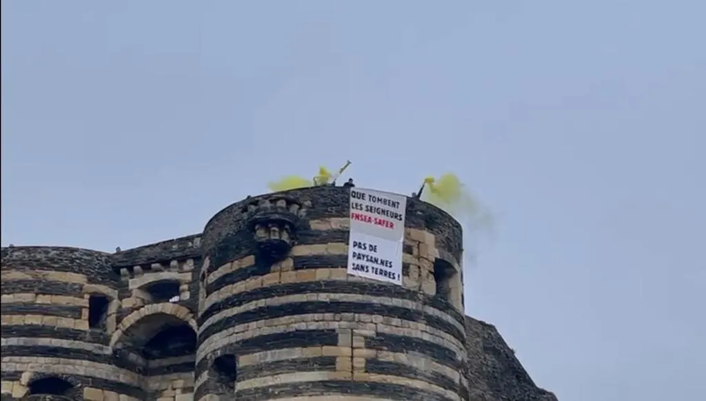 Des manifestants ont déployé une banderole sur le château d'Angers en soutien aux jeunes agriculteurs dont le projet d'installation à Denée a été rejeté par la Safer. On peut y lire « Que tombent les seigneurs FNSEA-Safer, pas de paysan(ne)s sans terres ! » © Ouest-France