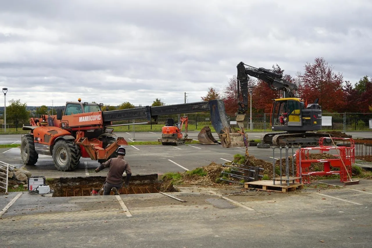 Les travaux ont déjà commencé sur le parking de l’espace Longuenée. L’entreprise de maçonnerie Cocault réalise les fondations qui recevront les charpentes métalliques de l’ombrière. © Ouest-France
