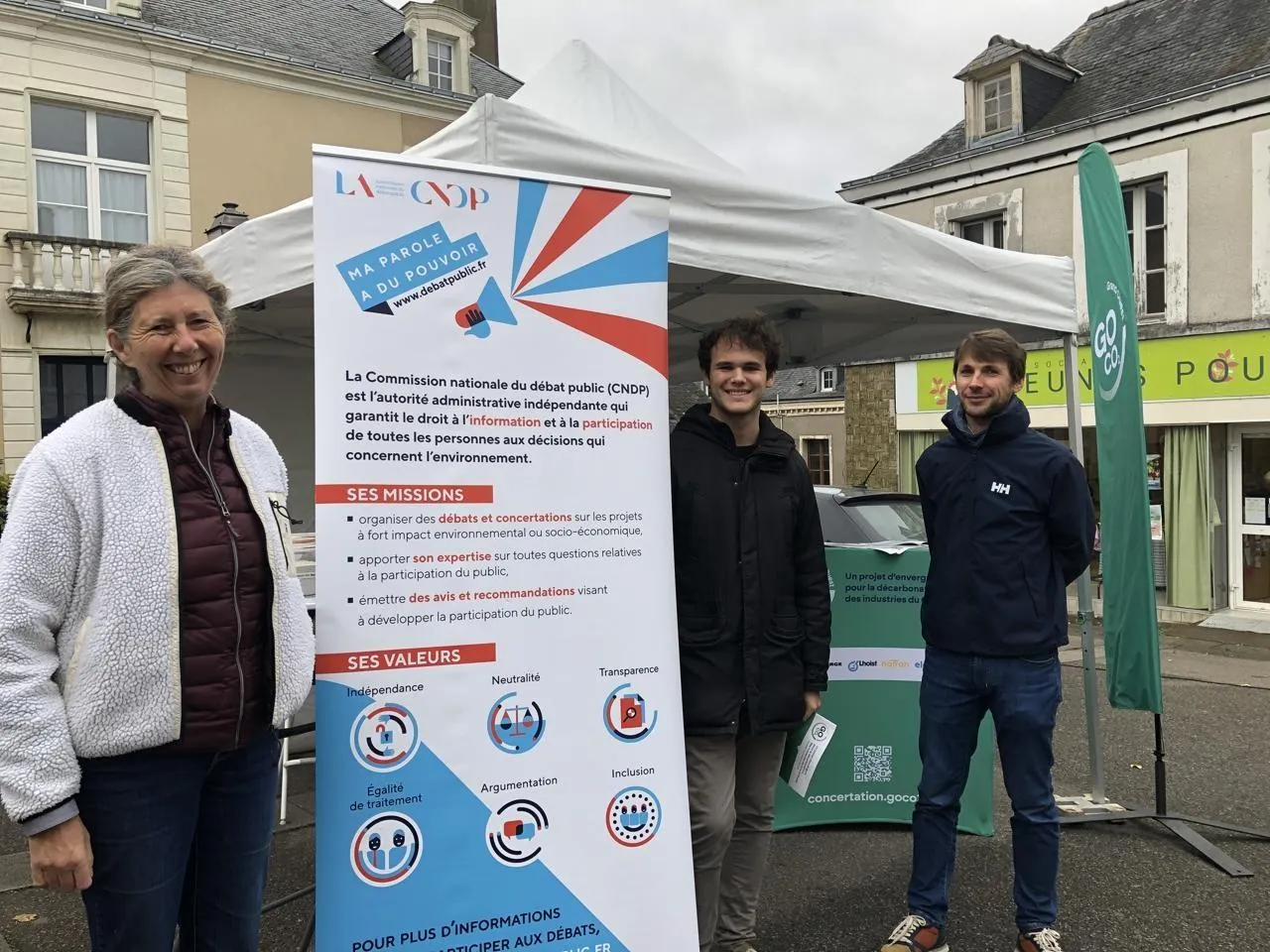 Catherine Trébaol, garante de la Commission nationale du débat public (CNDP), Téo Géraudie de l’entreprise Lafarge et Philippe Aubert du groupe NaTran, sur le marché de Pouancé, jeudi 6 novembre 2025. © Ouest-France