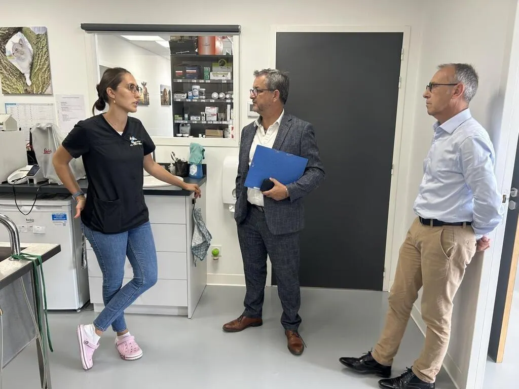Mazé-Milon, le 4 juillet 2025. Clémentine Amour, représentant la clinique vétérinaire du Couasnon, et le maire Christophe Pot pour la Ville ont signé une convention pour la gestion des animaux errants, en présence de Vincent Gaboriau, adjoint au maire. © CO - Christophe RICCI