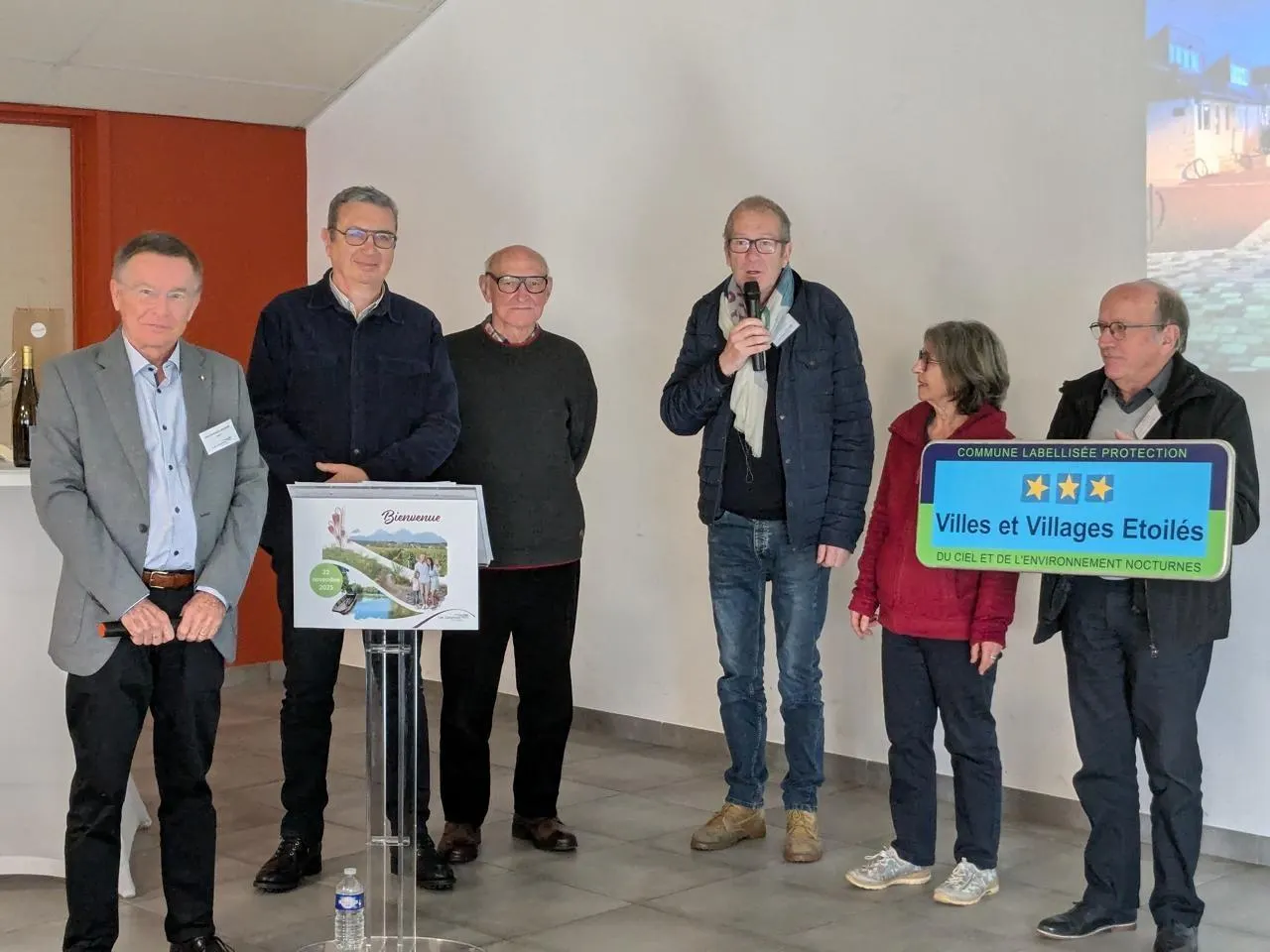 Marc Bainvel, premier adjoint au micro, a présenté les trois intervenants de l’association Anpcen, Philippe Gautier, Paul Blu (deuxième et troisième à gauche) et Monique Graveleau, en recevant le label des villes et Villages étoilés, lors de la cérémonie d’accueil des nouveaux habitants. © Ouest-France.