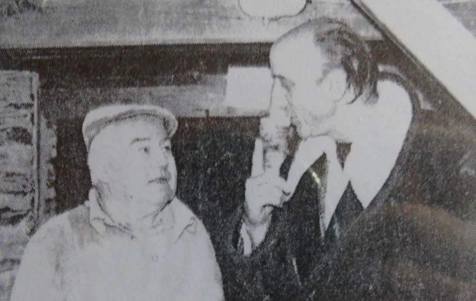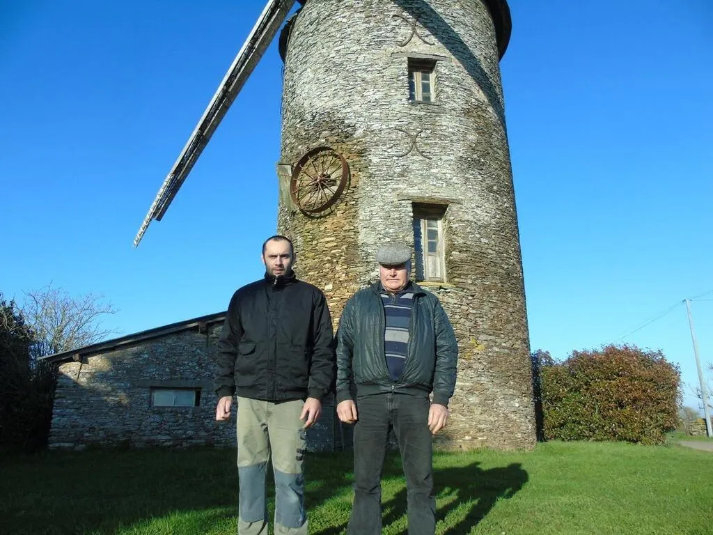 Paul Hoinard petit fils du « père Paul » avec son père Marcel Hoinard devant le moulin à l’arrêt. © Ouest-France