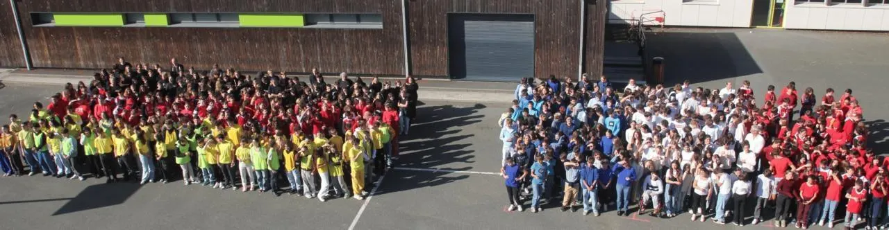 À l’occasion de la venue des correspondants allemands de Tecklenburg, les élèves des deux collèges ont formé leur drapeau tricolore respectif. © Ouest-France