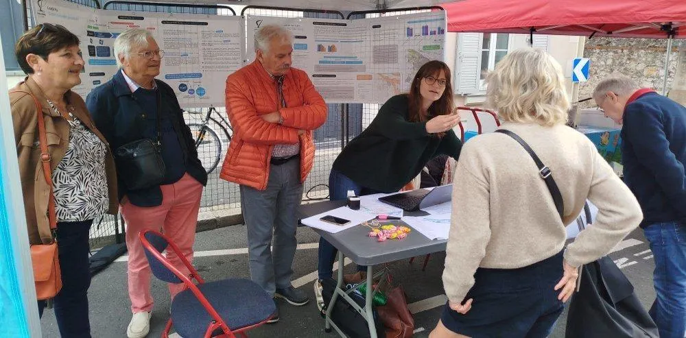 Les élus Annie Gourdon, Vincent Lavenet et Jacques Sarradin en compagnie d’Aurore Chaussepied, la responsable urbanisme de la mairie, ont écouté les requêtes sur le PLU au marché. ©  Ouest-France