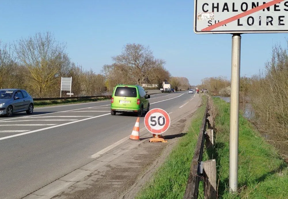 À 16 h, mercredi, la réouverture de la RD 961 entre Chalonnes et Saint-Georges était limitée aux véhicules légers à une vitesse de 50 km/h dans la traversée de l’île, entre le Grand-Bras et l’Asnerie. © Ouest-France