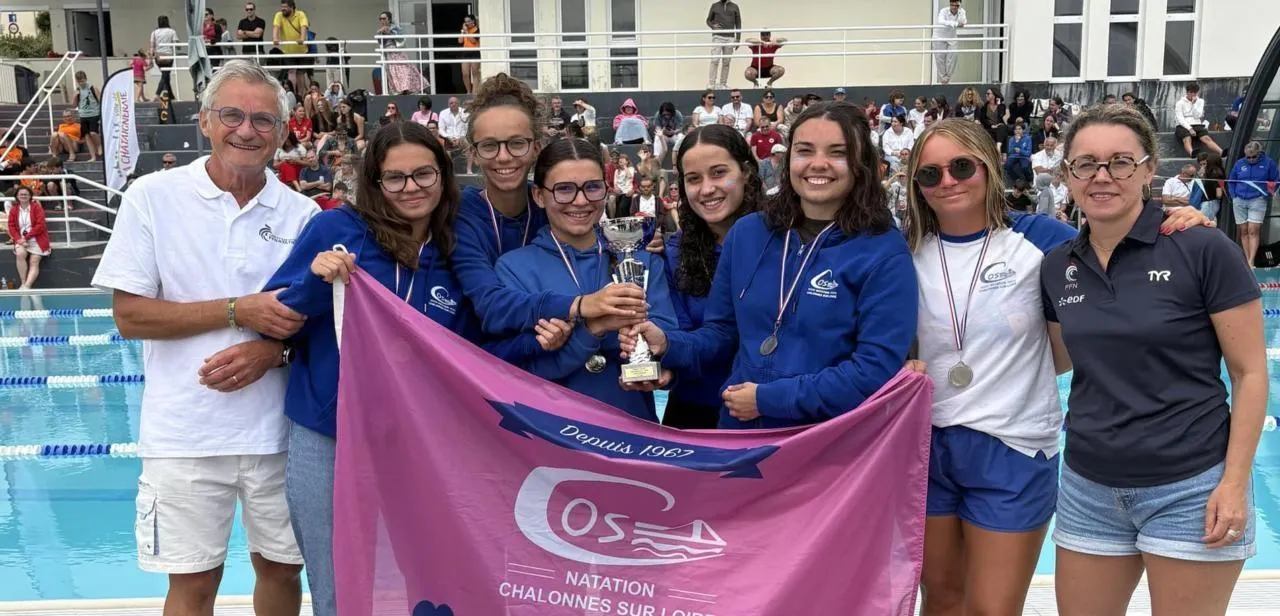 Guy Cochard, référent natation estivale à la Ligue de natation des Pays de la Loire et impliqué de longue date au club, intervient désormais comme jury. Lou Farges-Onillon, Emma Bretaudeau, Chloé Poupart, Maëlle Guyot, Maëlys Boisdron (nageuse et coach de l’équipe), Louisa Cebola, les six nageuses de l’équipe et Delphine Boisdron, présidente du club?. © COS Natation