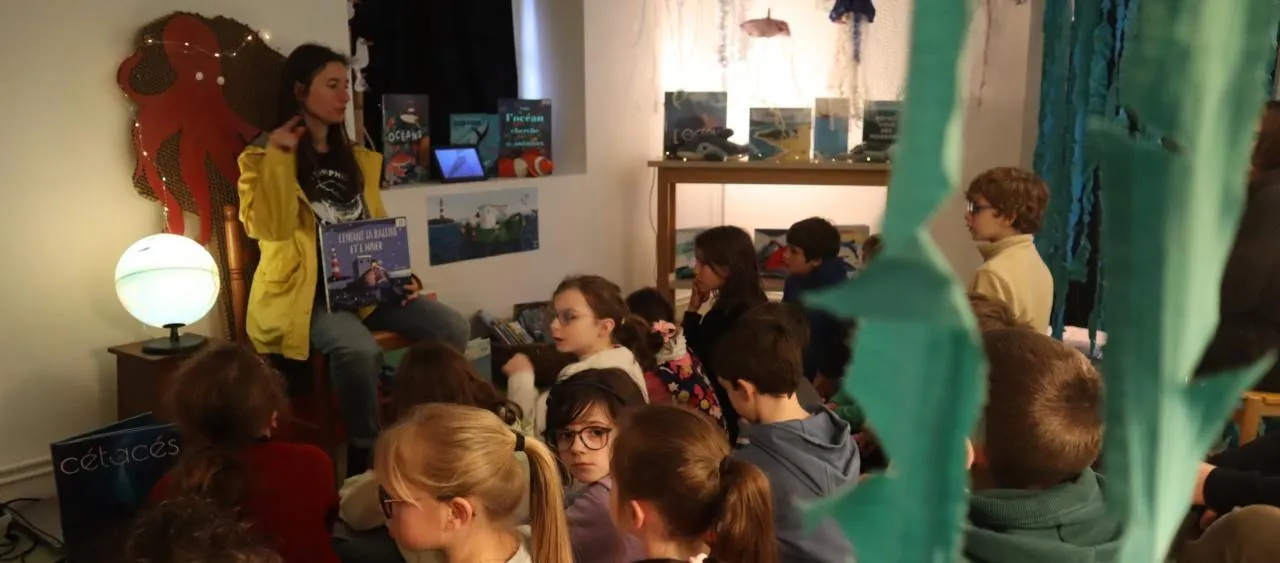 La classe de CE2 d’Arnaud Boulben écoute l’histoire lue par Julie Husson, responsable du secteur jeunesse de la médiathèque dans un décor sous-marin réalisé par l’équipe de la médiathèque. © CO