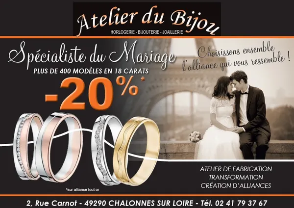 À Chalonnes sur Loire, L'Atelier du Bijou met à votre disposition un choix impressionnant de 200 modèles d'alliances. Que votre goût se porte vers des classiques intemporels ou des designs plus modernes, vous trouverez la bague qui vous ressemble et vous assemble.