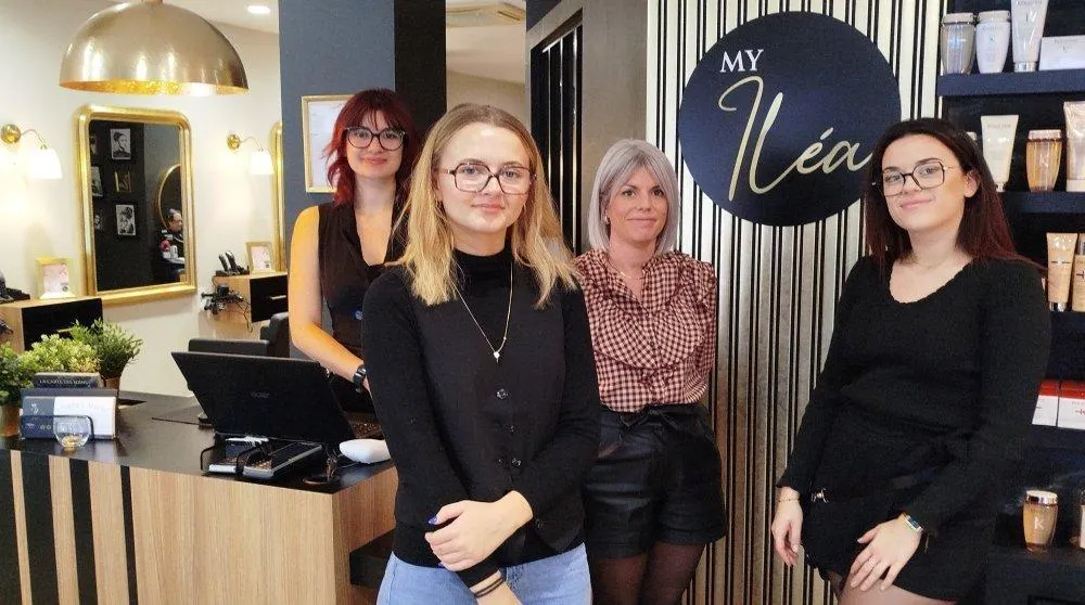 De gauche à droite, le personnel du salon MY Iléa, à Chalonnes : Astrid, Romane, Carine Monnier, la propriétaire, et Flavy, la manager à Chalonnes. Absente, Anaëlle en formation à la chambre de commerce et d’industrie. © Ouest-France