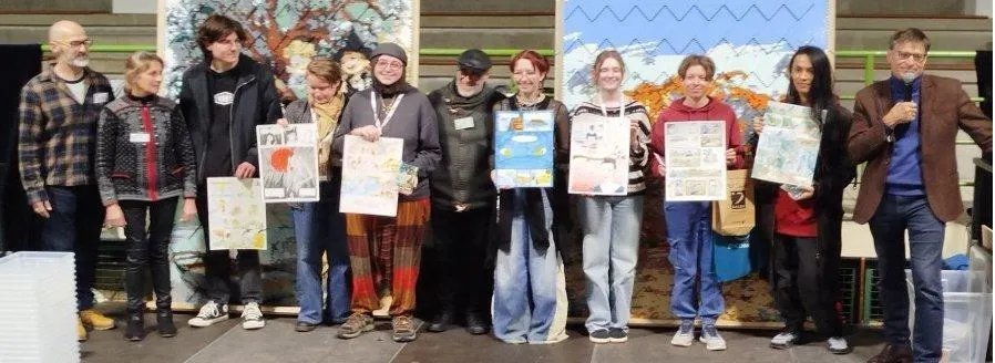 Sur le podium, tous les amateurs récompensés par le dessinateur Vincent Bruneau à gauche, et Fernando Gonçalves, le président du festival, à droite. © Ouest-France