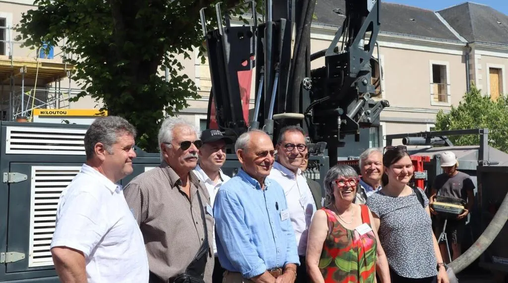 Les élus et chargés de l’opération ont observé la foreuse entrer en action. Trois forages à 199 mètres de profondeur sont en cours de réalisation, rue des Poilus, par Géoforage 49 de Saint-Georges-des-Gardes. © CO