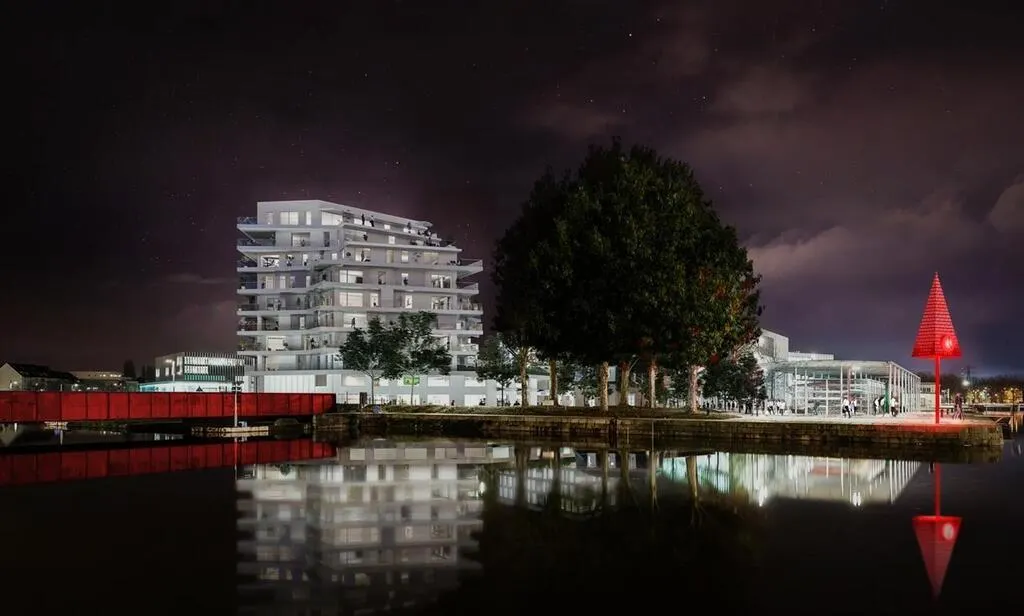 Le « 101e clocher » du Studio 5.5, sur la Presqu’île, en forme de balise rouge, marque l’entrée maritime de la ville de Caen (Calvados). © Studio 5•5