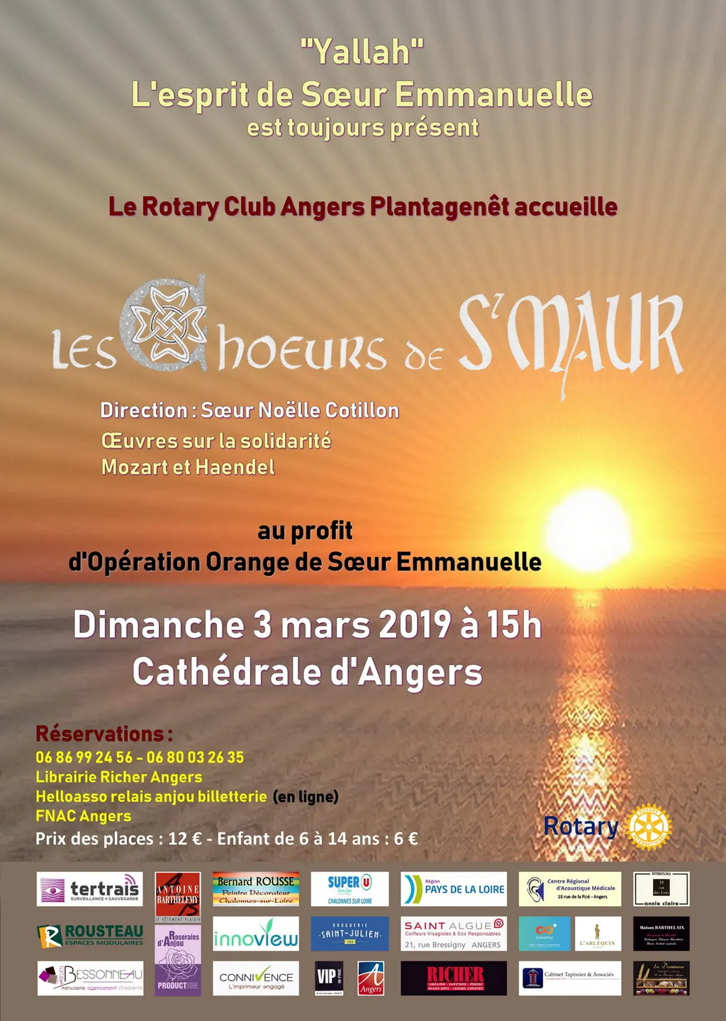 Ce concert est organisé par le Rotary Club Angers Plantagenêt et le Relais Anjou au profit de l'Opération Orange de Soeur Emmanuelle. La totalité des recettes sera versée au projet Nyarjwa qui financera un programme d'irrigation au Sud-Soudan