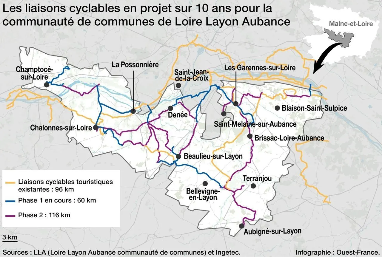 La communauté de communes de Loire-Layon-Aubance, au sud d’Angers (Maine-et-Loire) s’est engagée à quadrupler ses liaisons à vélo d’ici à 2035. Elles permettront de circuler en toute sécurité pour rejoindre les principales communes. Une première phase de 60 kilomètres doit être réalisée à partir de janvier 2026, pour un coût de 13 millions d’euros.