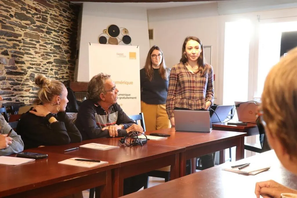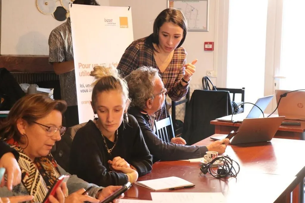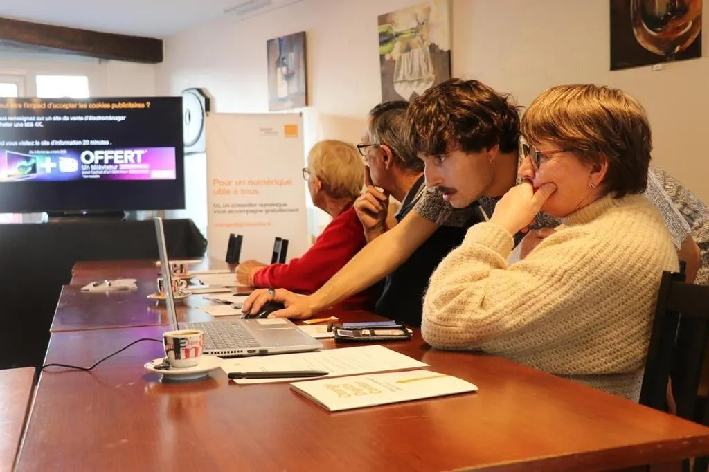 Jeudi 10 novembre, des conseillers numériques sont intervenus lors d’un atelier sur le numérique organisé au café multiservice d’Angrie, dans le cadre d’un nouveau partenariat entre Orange et le Groupe SOS. © Ouest-France