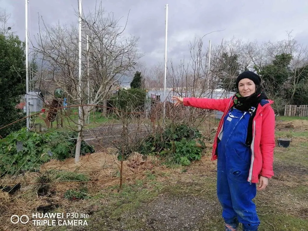 Sandrine Abayou, membre du groupe ZUR, fait la visite. On est ici tout près de la terrasse bois, résultat d’un projet étudiant passé, dans une zone où le métal domine. Les glycines cherchent aujourd’hui à s’accrocher et à mettre en valeur « ce siège qui tourne. La question des assises reste à explorer sur le site ». © Ouest-France
