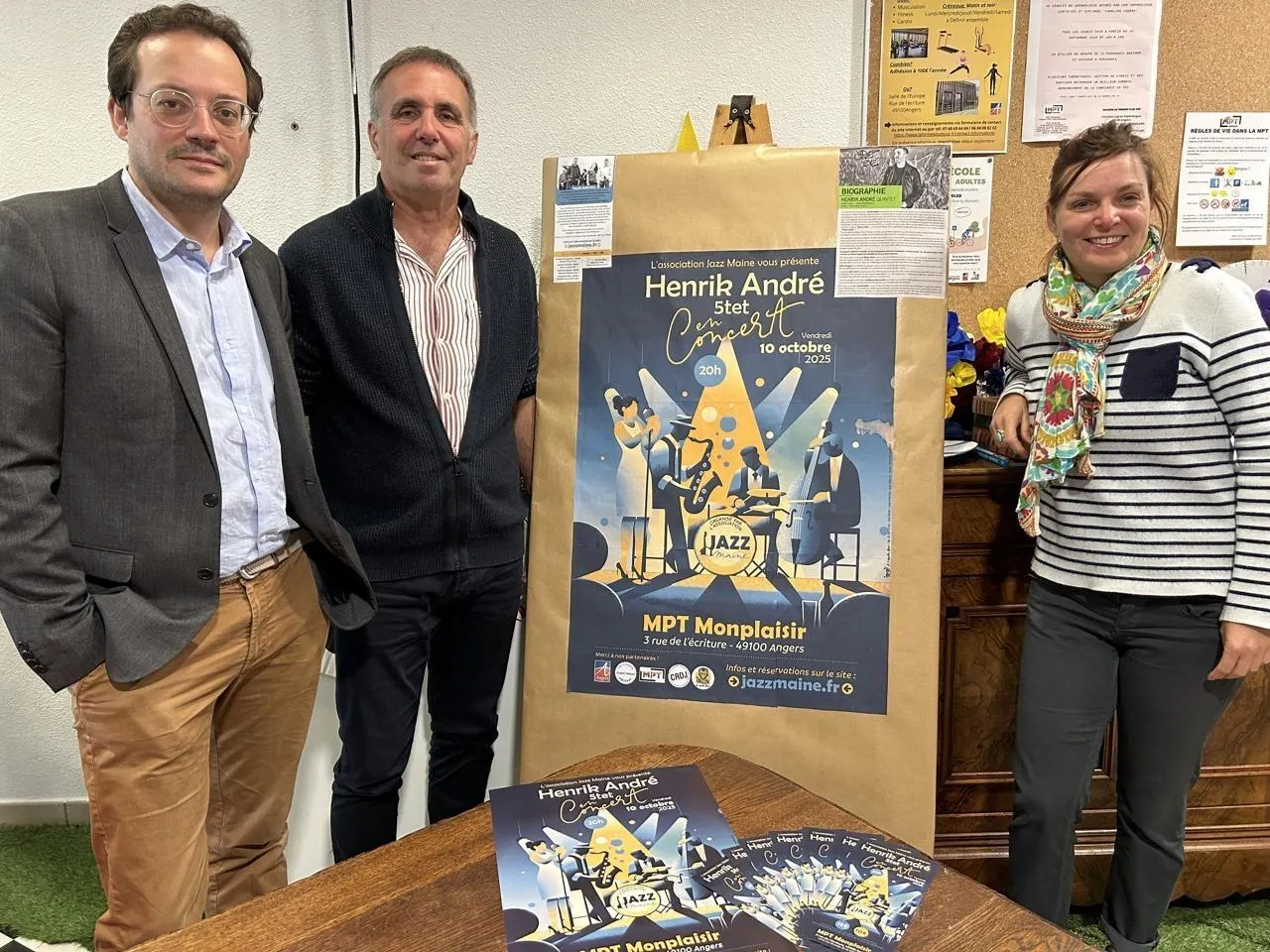 Angers, Maison pour tous de Monplaisir, le 22 septembre 2025. Alexis Denis-Callier, enseignant, Laurent Koenig, président de Jazz Maine, et Chrystelle Coraux, coordinatrice action culturelle à la MTP. © CO