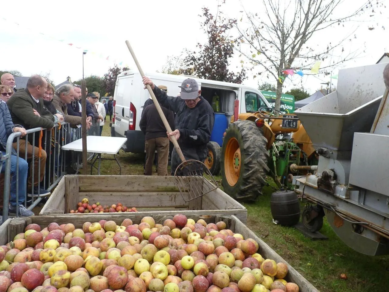 Démonstration de pressage des pommes lors de la foire aux pommes, sous le regard attentif du public. © Photo Comité des fêtes de Marigné
