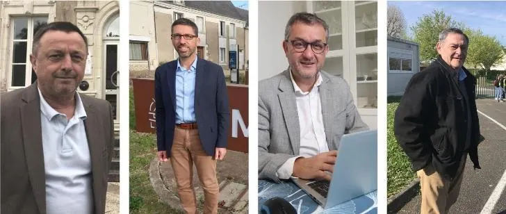 De gauche à droite : Sandro Gendron (Les Bois-d’Anjou), Tony Guéry (La Ménitré), Christophe Pot (Mazé-Milon) ont d’ores et déjà annoncé leur volonté de briguer un nouveau mandat dans leur commune respective. À Beaufort-en-Anjou, Alain Dozias ne s’est pas encore prononcé. © CO
