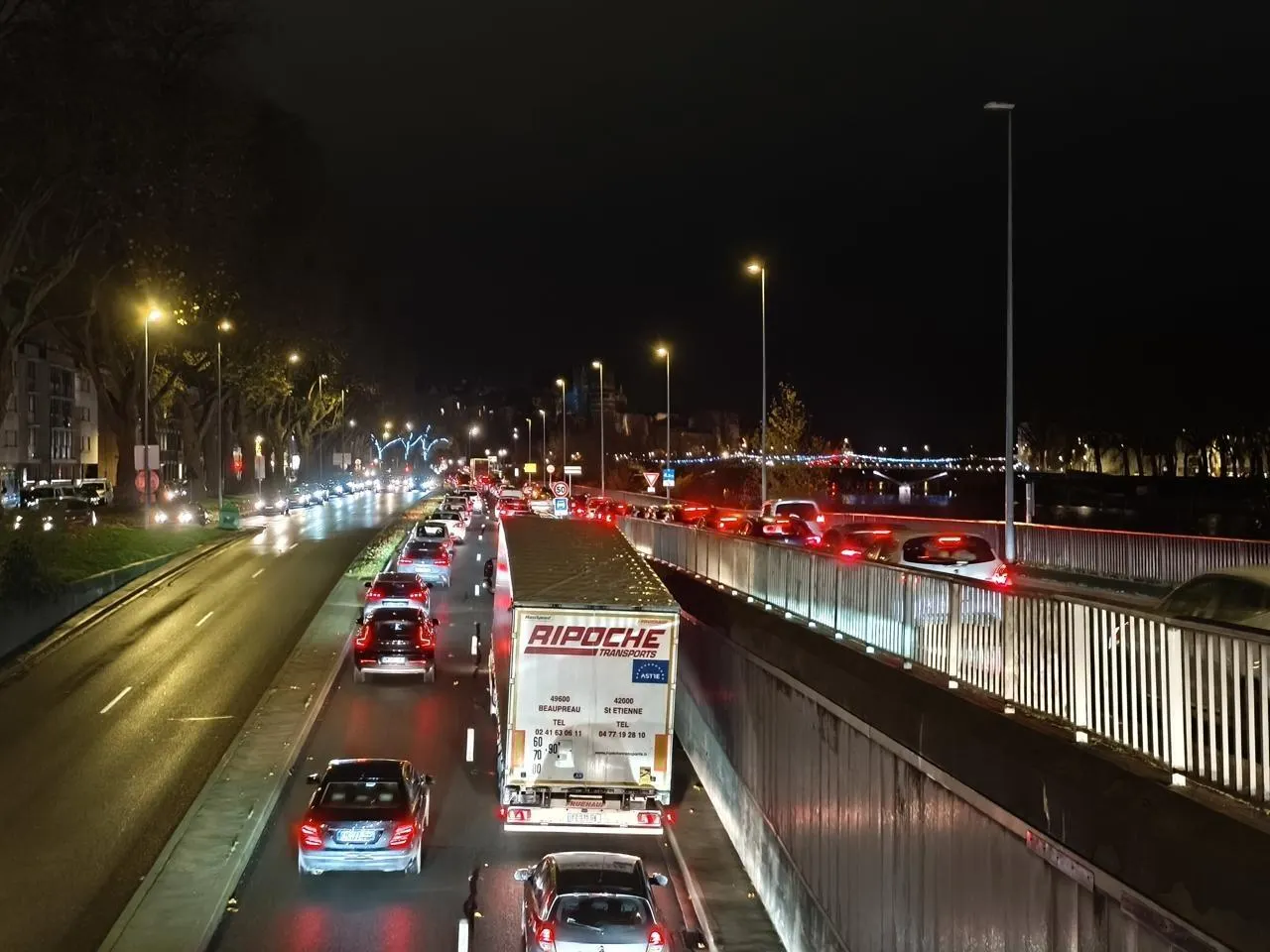 Des bouchons de plusieurs kilomètres sur les voies sur berges à Angers le 5 décembre 2025. © Ouest-France