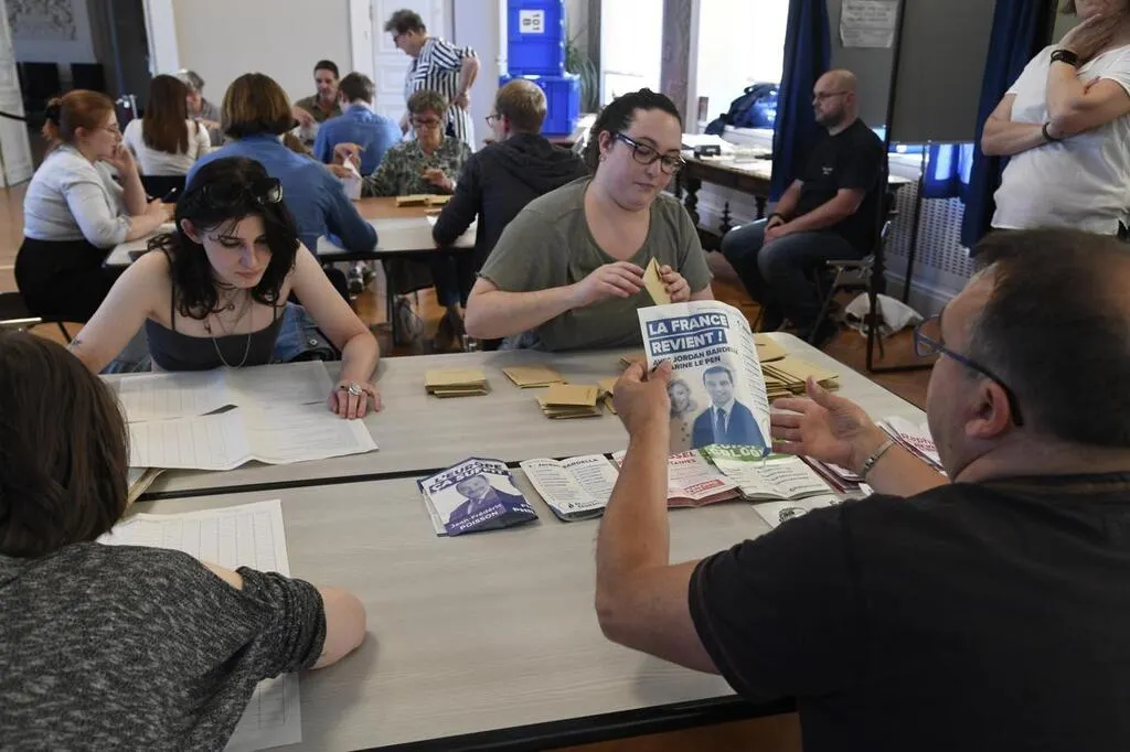 À Angers, alors que Jordan Bardella (RN) s’est déjà exprimé pour demander la dissolution de l’Assemblée nationale, le dépouillement ne fait que commencer à la mairie d’Angers. Les tables sont trop petites pour déplier en entier les bulletins. Mais sur les 38 listes candidates, seulement une dizaine semble avoir les faveurs des électeurs des bureaux 101 et 102 à l’hôtel de ville.