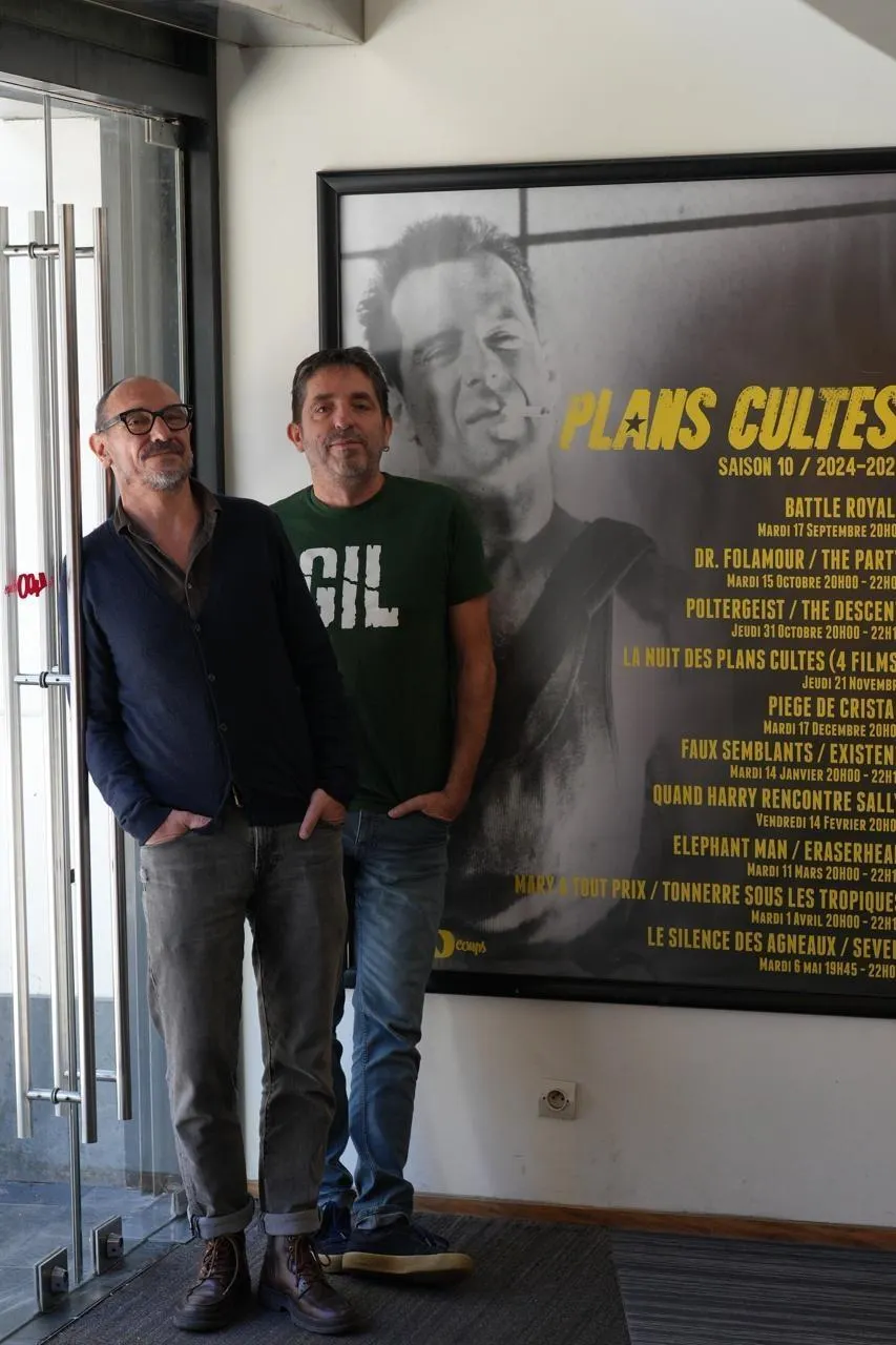 Angers, Les 400 Coups, jeudi 12 septembre 2024. Georges-Henri Saulou et Laurent Blouineau, deux des gardiens du temple Plans Cultes, devant l’affiche des dix ans. © TOLLIDJI