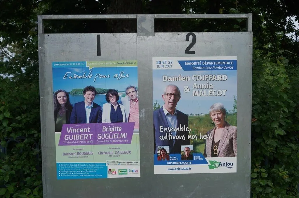 Deux binômes s’opposent dans le canton des Ponts-de-Cé, près d’Angers (Maine-et-Loire) qui compte huit communes pour 37 539 habitants. À gauche, la sortante Brigitte Guglielmi repart avec Vincent Guibert. Ils sont menacés par Damien Coiffard et Annie Malécot, au centre-droit.