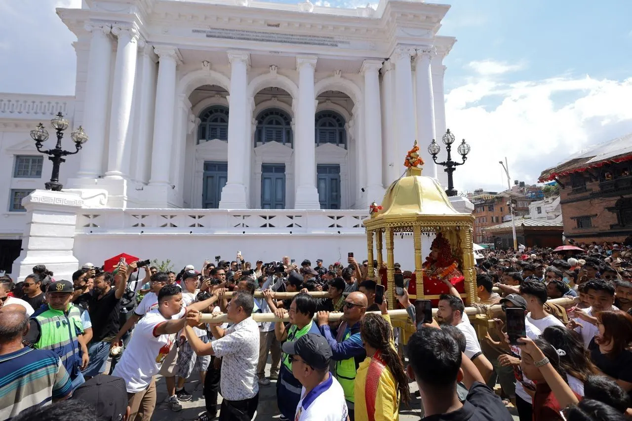 Aryatara Shakya, 2 ans et 8 mois, est la nouvelle « déesse vivante » Kumari de Katmandou, au Népal. Ce mardi 30 septembre 2025, elle a quitté le domicile familial pour intégrer le palais dont elle ne sortira plus qu’à de rares occasions, lors de festivals religieux, jusqu’à sa puberté. © EPA/MAXPPP/NARENDRA SHRESTHA