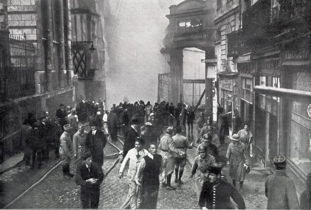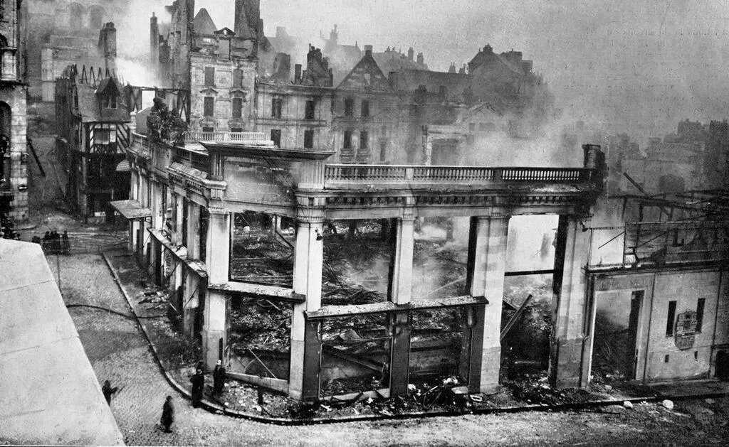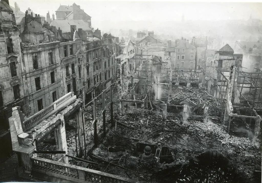 Le 21 novembre 1936, vers midi, le feu embrase le Palais des Marchands, en plein centre-ville d’Angers. Deux heures plus tard, il ne reste plus rien de ce qui fut le plus grand magasin d’Angers. Les flammes ont aussi détruit de nombreuses maisons en torchis, situées à proximité. © Archives municipales ville d’Angers
