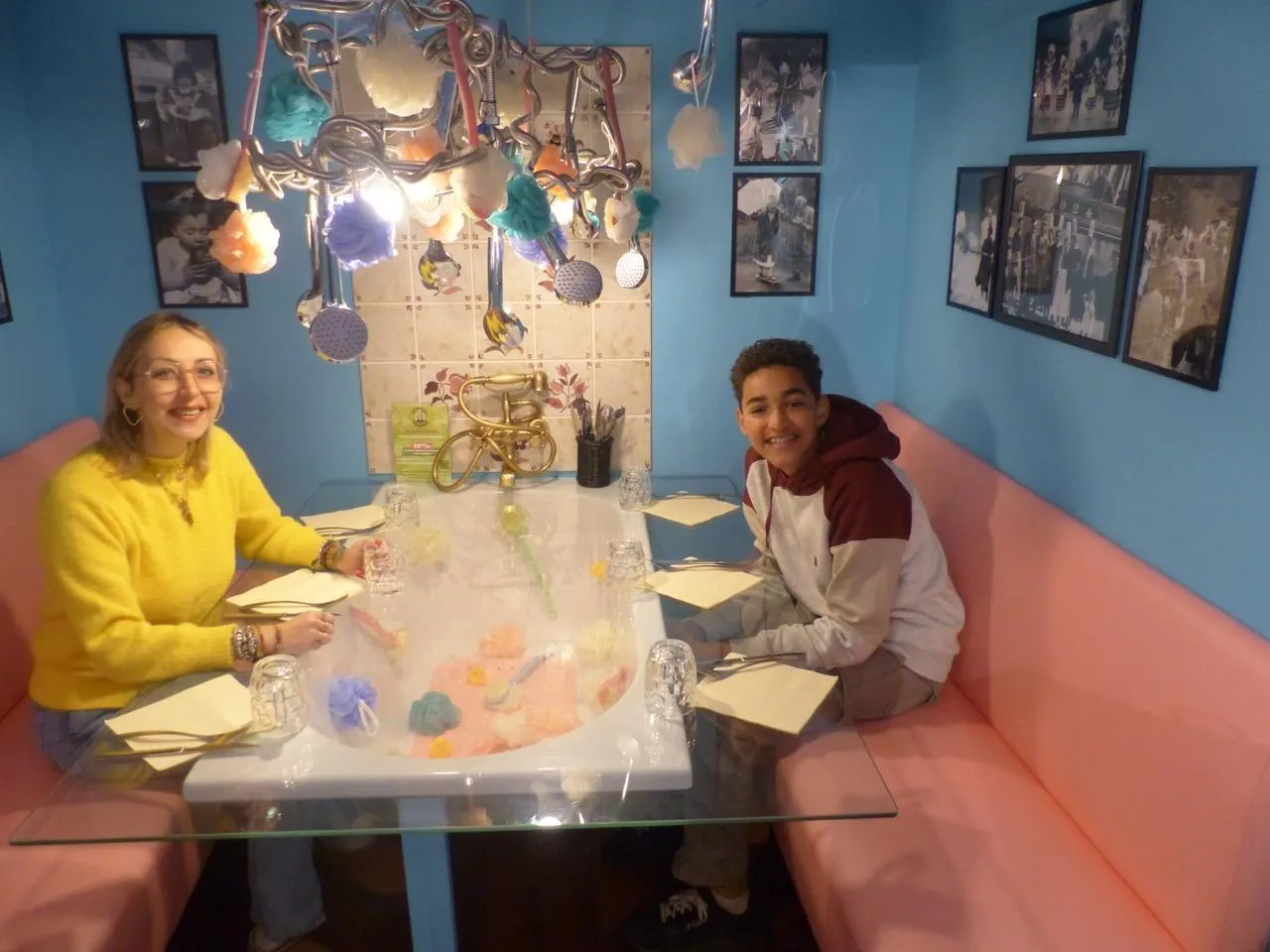Envie de déjeuner en famille sur une grande table de verre au-dessus d’une baignoire ? Pas de problème ! En prime, une vue imprenable sur tout un régiment de pommeaux de douche, éponges et autres gratte-dos.