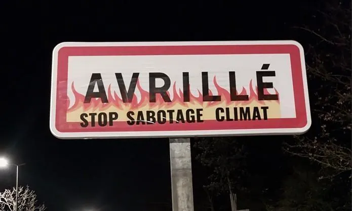 Le panneau d’entrée de ville d’Avrillé, en Maine-et-Loire, recouvert de flammes. © Greenpeace Angers