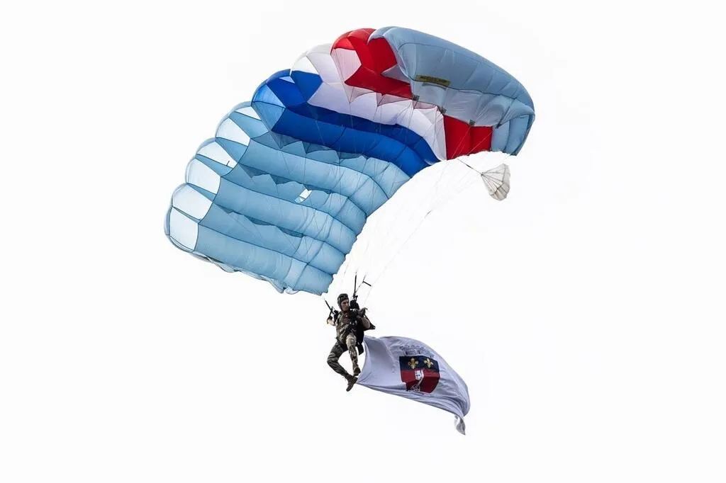 Angers, le 13 juillet 2025. Un des parachutistes a réussi à atterrir au centre de la place Leclerc, malgré le vent. CO - Regine LEMARCHAND