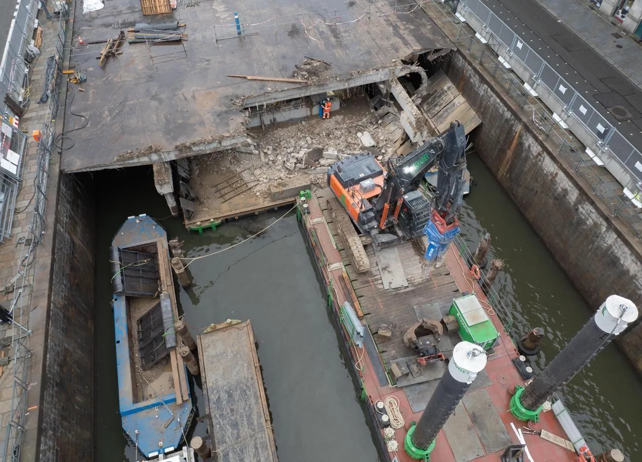 Une pelleteuse de 50 tonnes équipée d’une cisaille, est positionnée sur un ponton flottant de 24 mètres. Elle est entrée en action pour grignoter le parking Vilaine dans le centre-ville de Rennes (Ille-et-Vilaine). Photo aérienne réalisée depuis un drone le 16 décembre 2025. © DAVID ADEMAS / OUEST-FRANCE