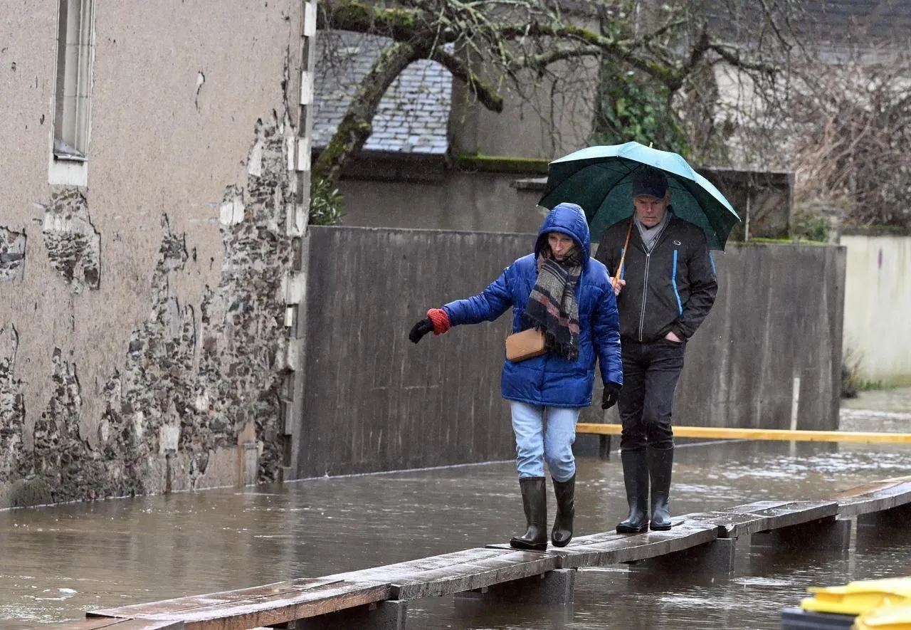 À Bouchemaine (Maine-et-Loire), certains habitants ne peuvent accéder à leur logement qu’en circulant sur des bastaings, ce jeudi 19 février 2026. © Jérôme Fouquet/Ouest-France