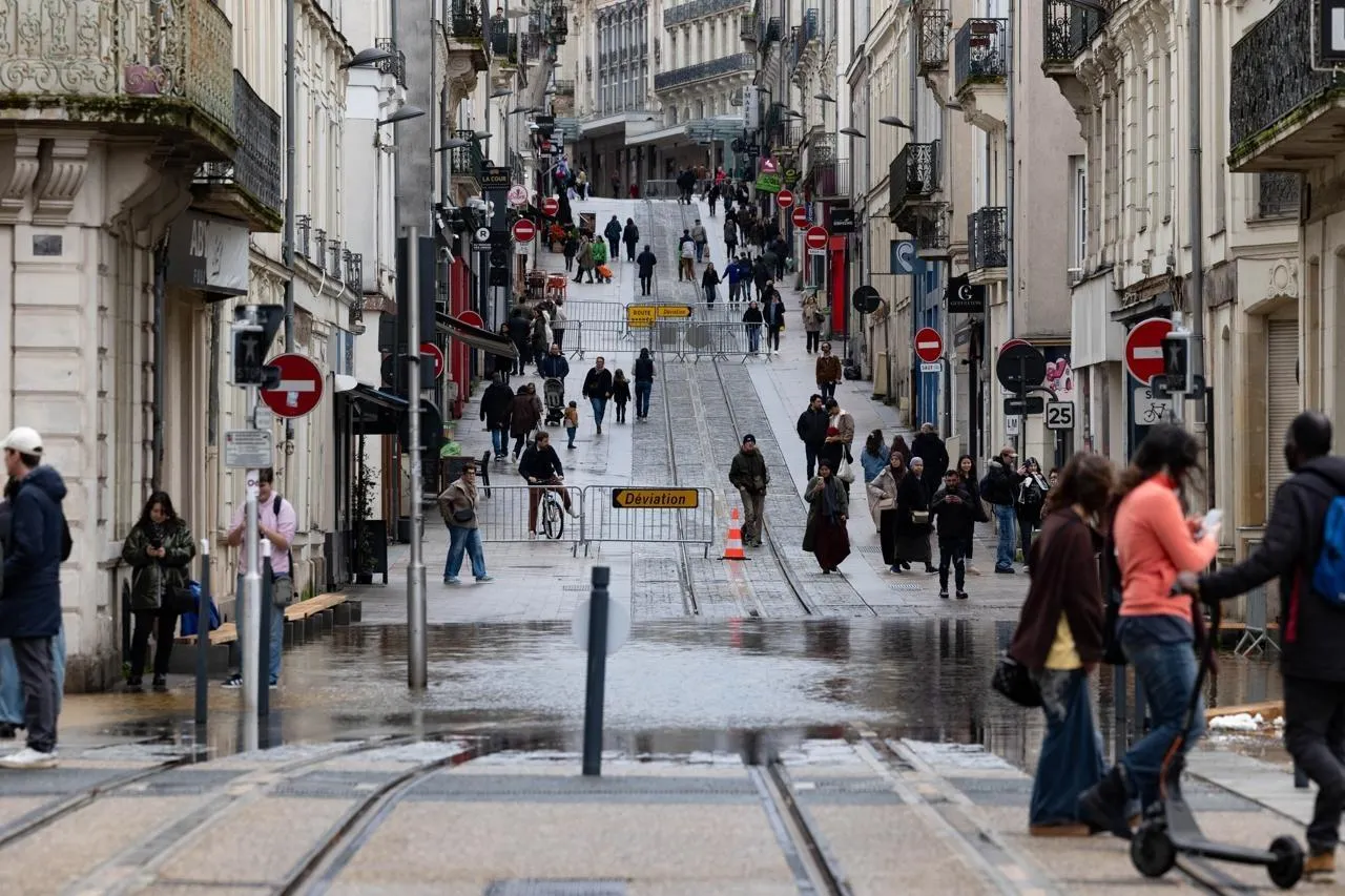 Centre-ville d’Angers, samedi 21 février 2026 : les piétons se fraient un chemin dans les rues inondées. © CO - Régine Lemarchand