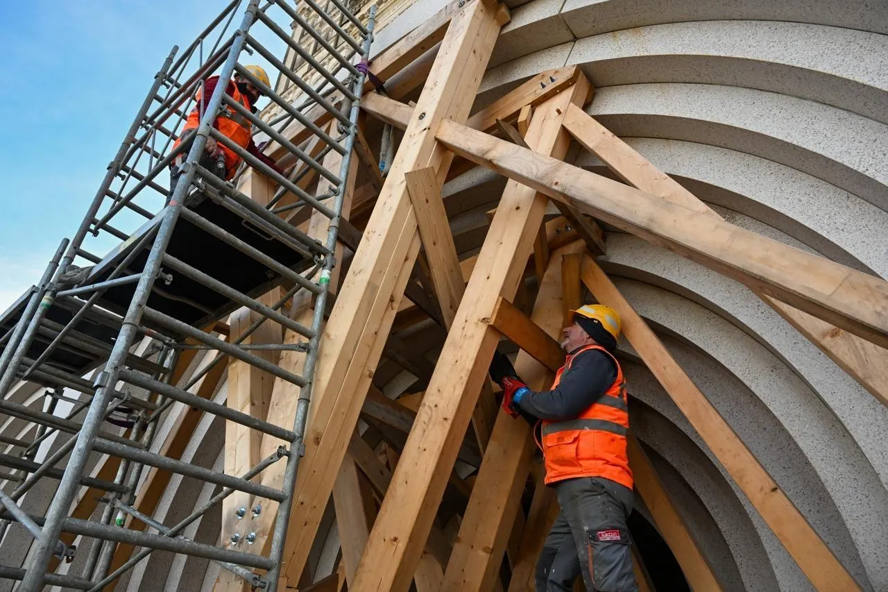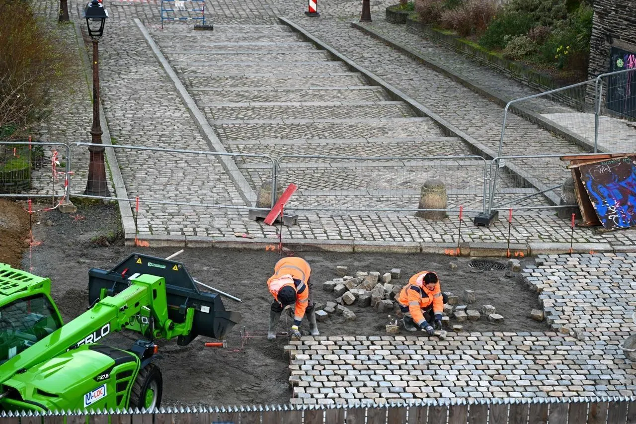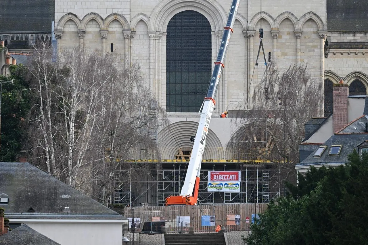 Angers, place Mgr-Chappoulie, 28 janvier 2026. Les maçons de l’entreprise Albizzeti (Territoire de Belfort) sont à pied d’œuvre depuis huit mois sur le site de la cathédrale Saint-Maurice. Le décoffrage des cinq arcades de la galerie doit commencer la semaine prochaine. © CO - Laurent COMBET