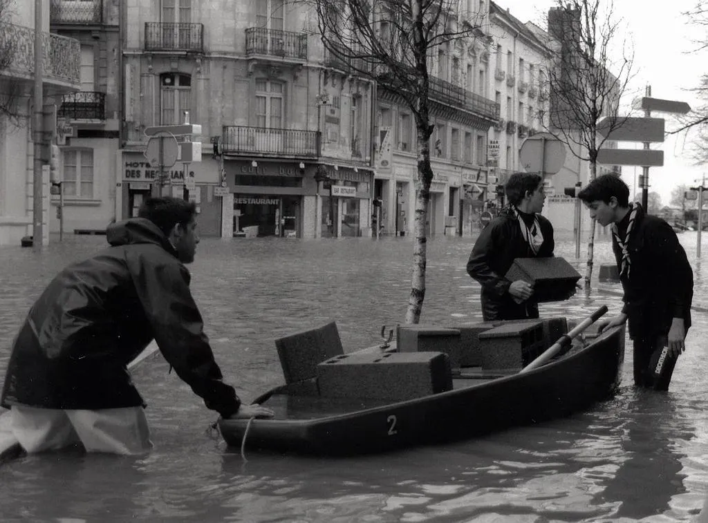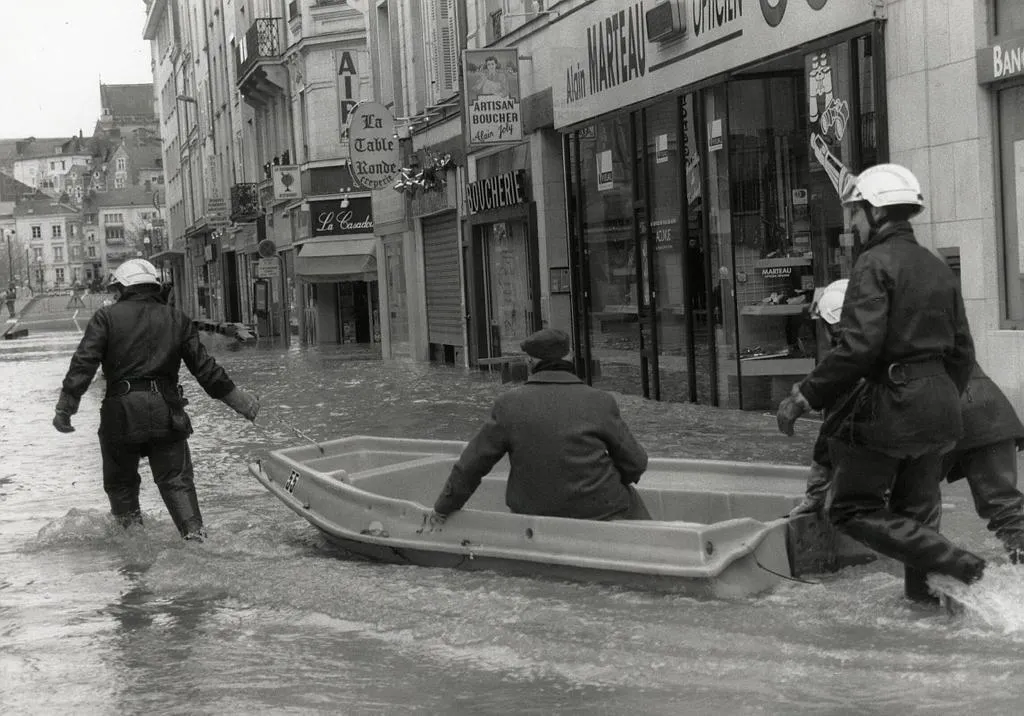 Il y a vingt-sept ans, jour pour jour, des quartiers comme la Doutre et Saint-Serge étaient inondés. Dans le premier, les caves sont englouties et des passerelles en bois sont disposées pour permettre aux piétons de circuler au-dessus du niveau de l’eau. On se déplace même en canot à moteur dans les rues : ceux de la Société nationale des sauveteurs en mer (SNSM), réquisitionnés par la préfecture pour faire office de bateau-taxi.