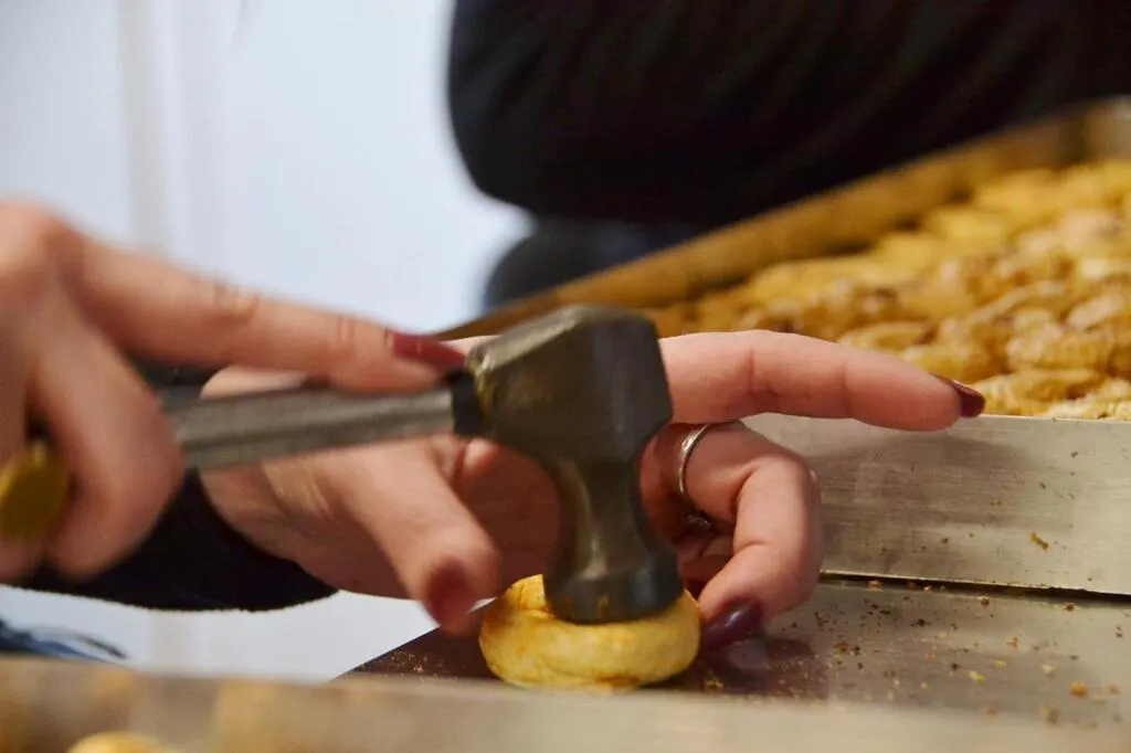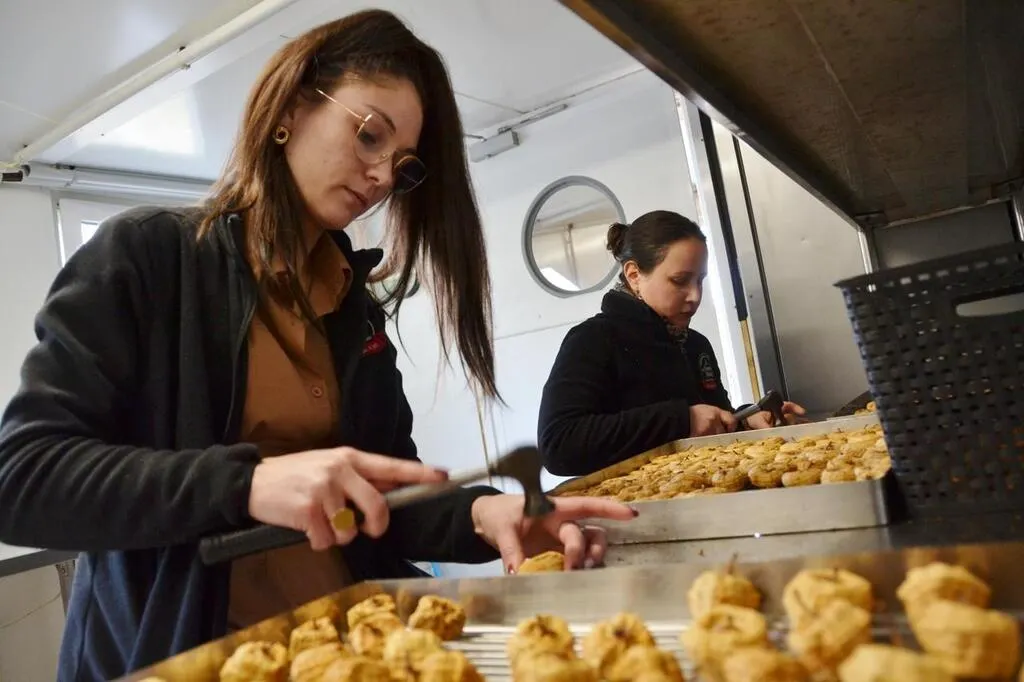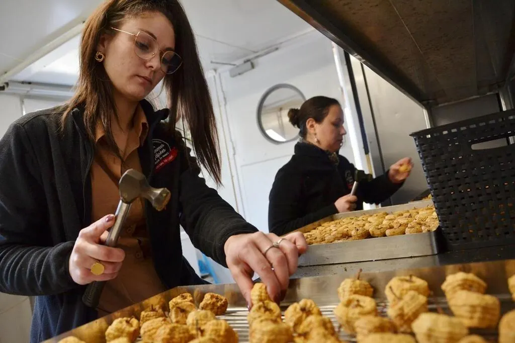 Turquant, vendredi 23 février. Mélina Mabille et Léa Bohn, salariés des Pommes tapées du Val de Loire, jouent du marteau tout l’hiver. © CO - Carl GUILLET