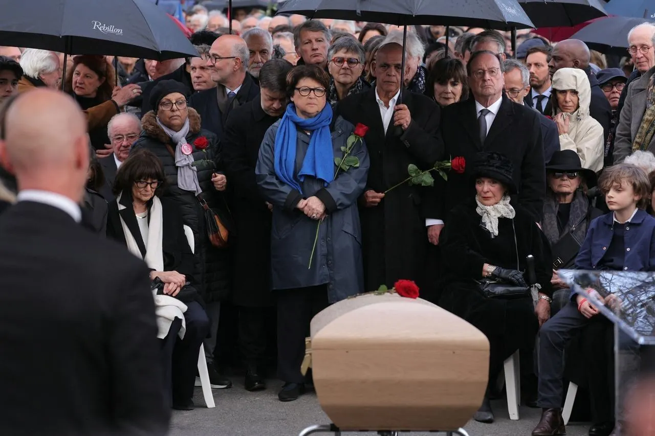La femme politique Martine Aubry (au centre gauche) et l’ancien président François Hollande (au centre gauche) assistent aux obsèques de l’ancien Premier ministre Lionel Jospin au cimetière du Montparnasse à Paris, le 26 mars 2026. © THOMAS SAMSON / AFP