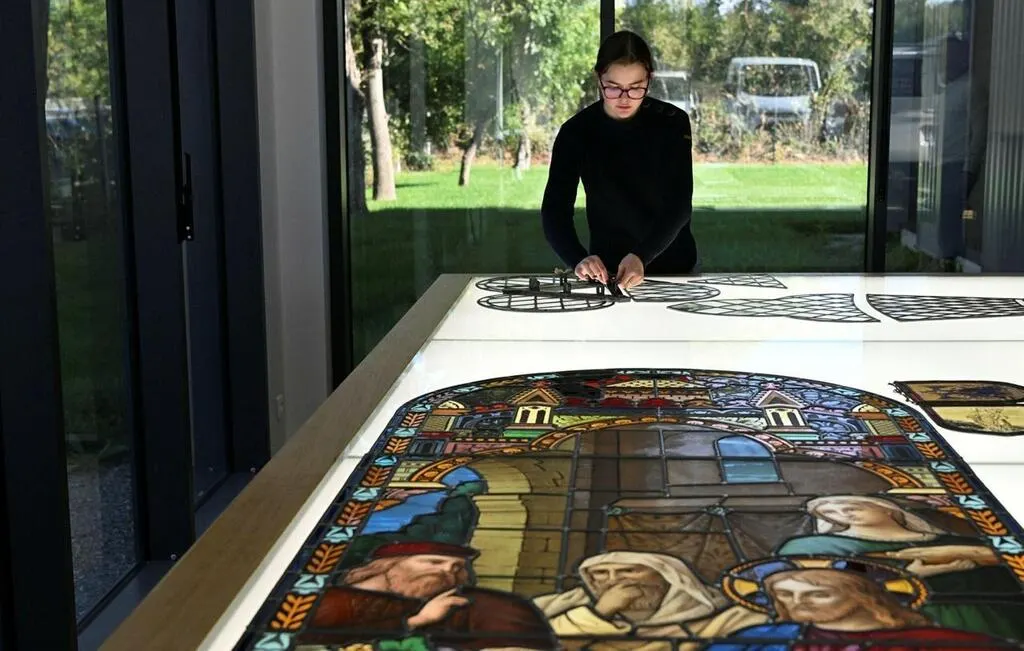 Saint-Leger-de-Linieres (Maine-et-Loire), octobre 2023. L’entreprise Barthe-Bordereau a décrocher le marché de la restauration des vitraux de la flèche de la cathedrale Notre-Dame de Paris. © CO - Josselin CLAIR